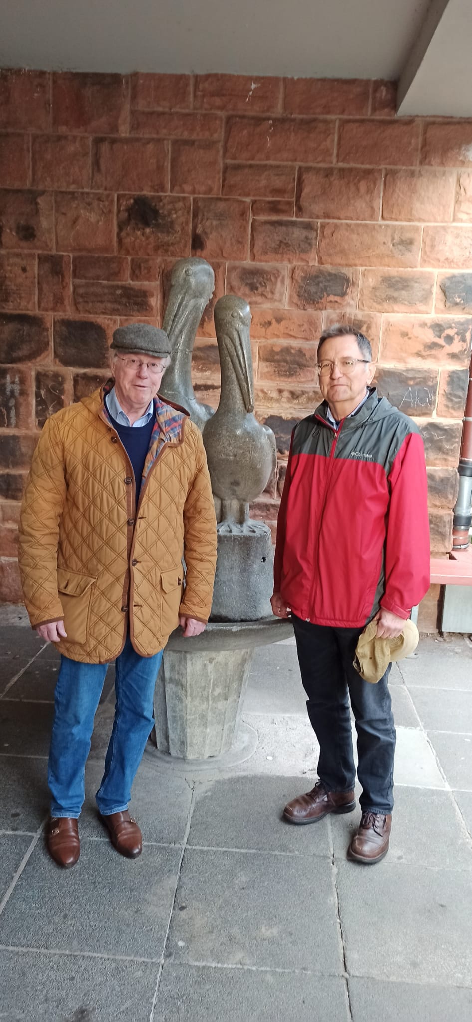 Sofort habe ich ihn angerufen -  und das ist der Grund, weshalb ich mit Achim neben dem Pelikan Brunnen auf dem Photo zu sehen bin.