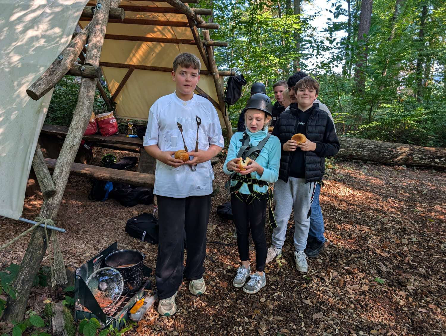 Zur Mittagspause gab es Würstchen mit Senf und erfrischende Getränke. Nach einer zweiten Kletterrunde wanderte die Gruppe zurück zur Bushaltestelle in Wehrshausen, von wo der Bus sie wieder in die Stadt brachte.