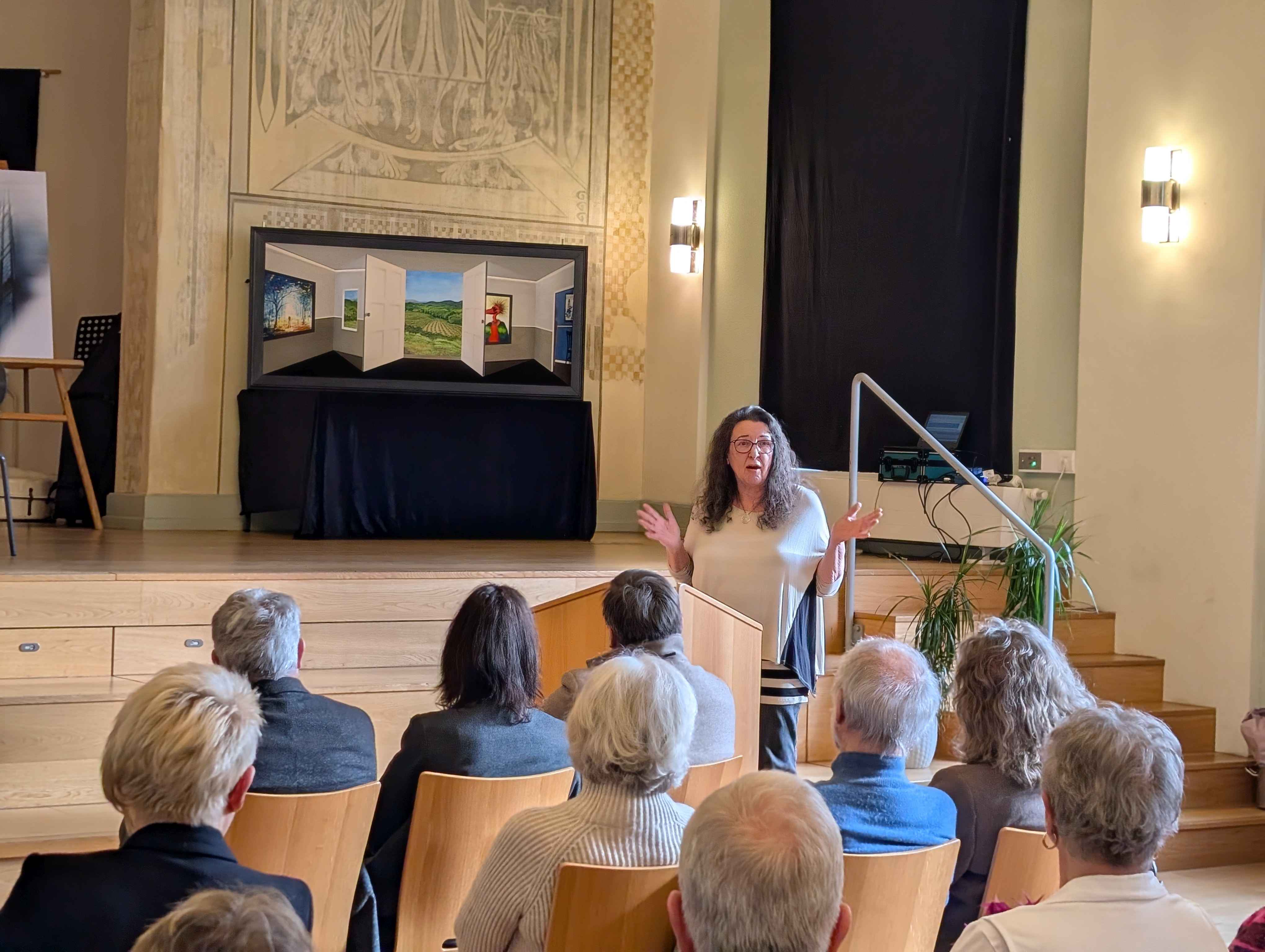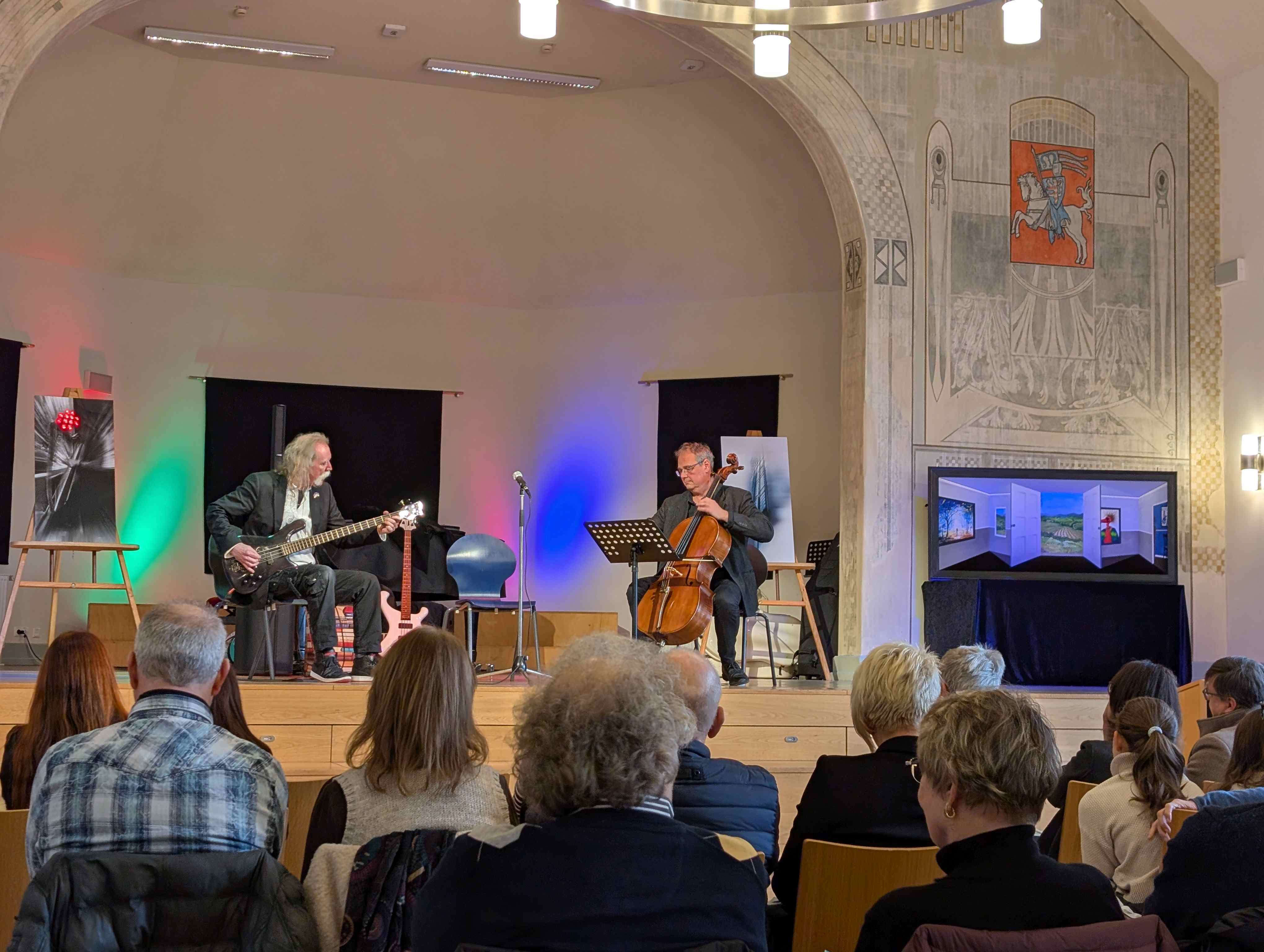 Das Konzerts war darüber hinaus auch als Finissage der Ausstellung „Visuelle Poesie“ mit Arbeiten von Inge Eisman-Nolte und Werner Eisman konzipiert. Zum letzten Mal wurden an diesem Abend die Arbeiten in der Schule gezeigt. Zur Erinnerung an die eindrucksvolle Ausstellung erwarb der Förderverein die Arbeit „Alles im Blick“ für die ständige Ausstellung im Foyer der Schule.