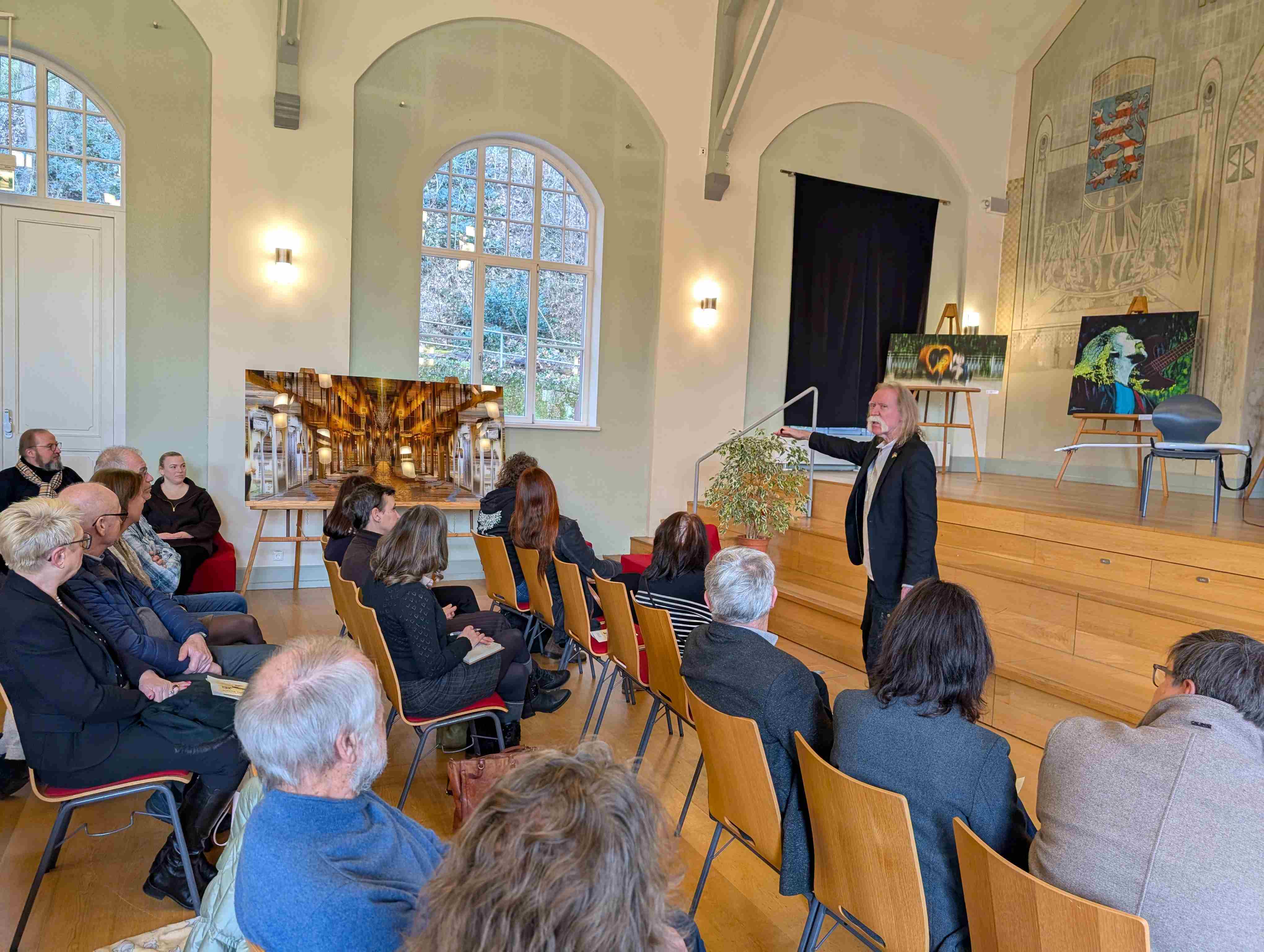 Am Samstag, den 17.1., wurde in der Mediathek der Emil-von-Behring-Schule zum 9. Mal die “Galerie in der Schule” eröffnet. Zum Teil großformatige Fotos und Gemälde des Künstlerpaares Werner Eismann und Inge Eismann-Nolte können zur Zeit im besonderen Ambiente des ehemaligen Turnergartens, jetzt Mediathek der Emil-von-Behring-Schule, betrachtet und erlebt werden. Auf musikalische Weise untermalt wurde die Veranstaltung durch Musik der Band “Softeis”, (heute mit Werner Eismann, Bass, und Gerhard Eismann, Gitarre, sowie Ronny Moucka, Gesang), die in Marburg schon seit Jahrzehnten als Garant für gute Rockmusik bekannt sind und heute “unplugged” Cover-Versionen von Deep Purple spielten.