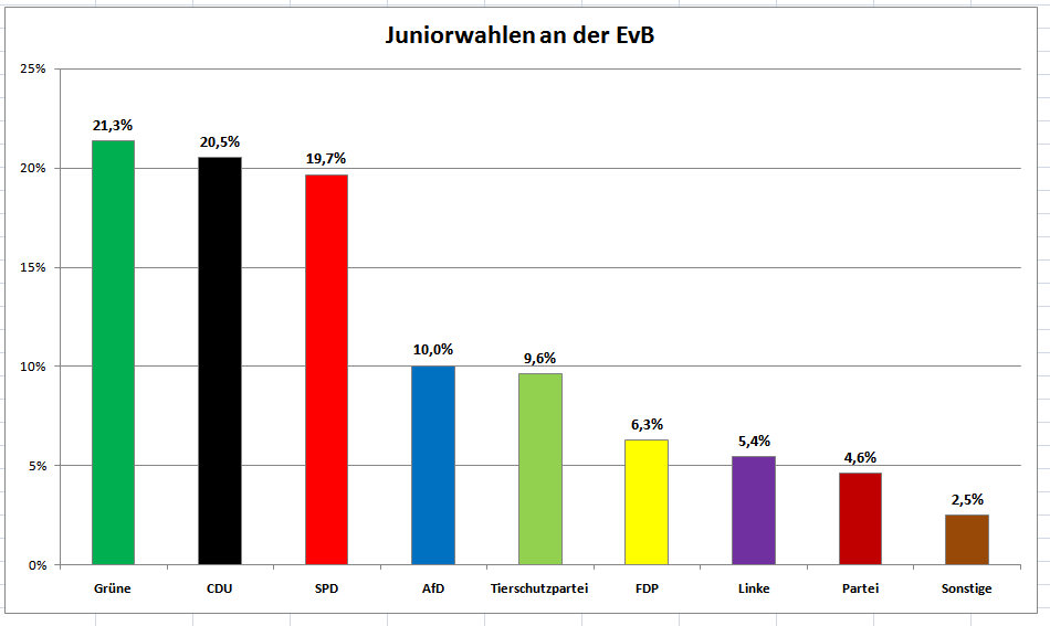 Im Rahmen der „Juniorwahlen“ konnten die Schüler der EvB einmal unter realen Bedingungen eine Wahl selbst mitmachen. Die 9cR hat die Wahl gemeinsam mit ihrem Politik-Lehrer, Herr Becker, vorbereitet und als Wahlvorstand durchgeführt. „Es lief super, weil sich die Schüler gut in die Regeln und Gesetze eingearbeitet haben“, so Herr Becker. „Sie sind an den Aufgaben gewachsen“, resümierte der vom Projekt begeisterte Lehrer weiter. Nahezu alle Schüler der Klasse 9cR habe man ein deutlich gesteigertes Interesse am Thema „Wahlen“ anmerken können.