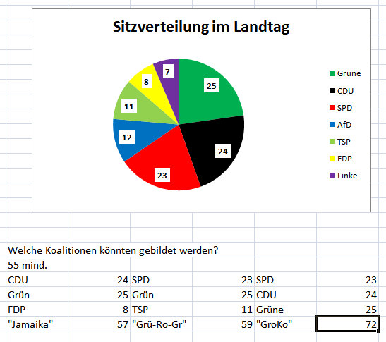 Die meisten Erststimmen hat die SPD, diese hat 32,2%, die zweitmeisten Stimmen hat die CDU mit 19,5% und die drittmeisten Stimmen hat die FDP mit 17,1%. Die meisten Zweitstimmen hat die SPD mit 28,1%, die zweitmeisten Stimmen hat die FDP mit 20,4% und die drittmeisten Zweitstimmen hat die CDU an unserer Schule erlangt.