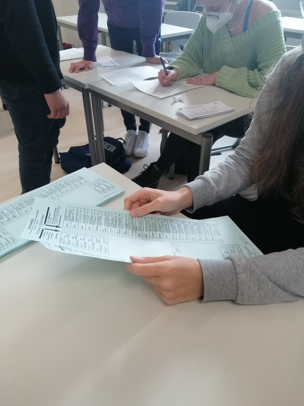Der Ablauf ist identisch, mit dem der „richtigen“ Wahl: Die Schüler*innen kommen zum Turnergarten (unsrem Wahllokal), dort wird ihnen gesagt, in welches Lokal sie gehen sollen und warten dann, auf den Einlass. Im Wahllokal, gehen die Wählenden zum Wahlvorstand, wo Ablauf und Fragen geklärt werden. Das Grundprinzip ist, wie bei einer Ü 18 Wahl – Man muss sich ausweisen und bekommt dann den Wahlzettel. Hierbei ist es wichtig zu erwähnen, dass man nicht so streng mit der Ausweisung ist, wie bei der „echten“ Wahl selbst. Hat man den Wahlzettel, geht man in eine freie Kabine und wählt. Sobald man damit fertig ist, faltet man den Zettel und wirft diesen in die Wahlurne. Anschließend kann man gehen.