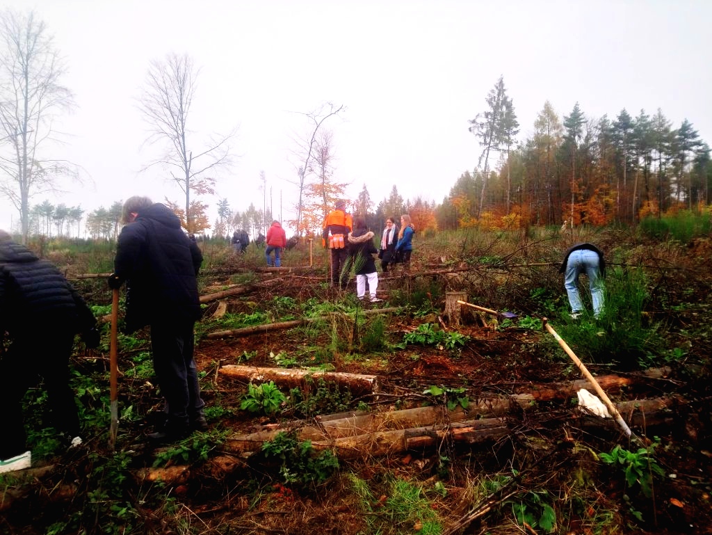 Anschließend machten wir uns in Gruppen daran, die farbig markierten Pflanzlöcher auszuheben. Herr Müller zeigte uns, wie man die jungen Bäume richtig und sorgsam einpflanzt. Insgesamt wurden 75 Bäume verschiedener Arten, wie Schwarznuss, Ulme und Speierling auf der ausgewiesenen Fläche gepflanzt, die die Waldinteressenten gespendet hatten.