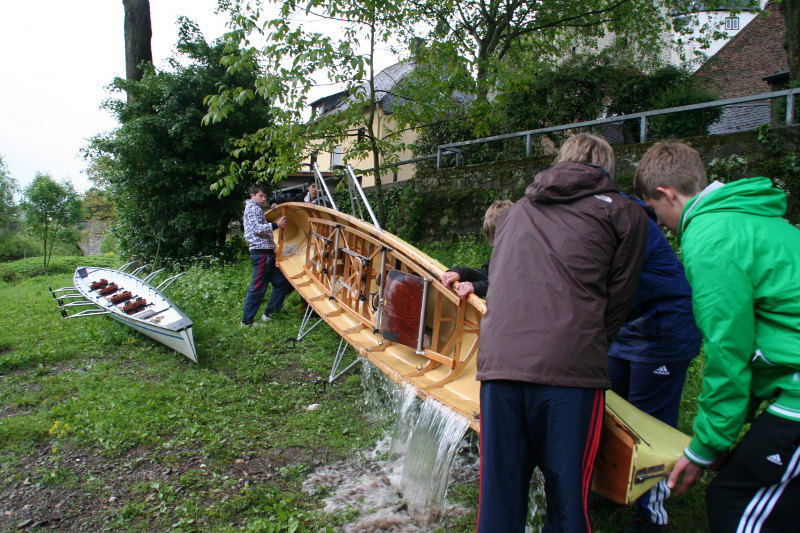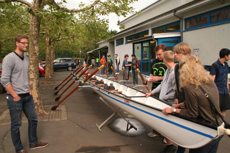 Zum krönenden Abschluss der Ruderwoche wurde eines der beiden Boote, das bei der Wanderfahrt zum Einsatz gekommen war, mit dem langen Bootsanhänger des Marburger Rudervereins durch die Oberstadt buchsiert, um es bei der Projektpräsentation zu zeigen. Schließlich befindet sich der „Emil“, ein gesteuerter Gig-4er, seit fast 2 Jahren im Besitz der EvB und konnte so der Schulgemeinde „persönlich“ vorgestellt werden.