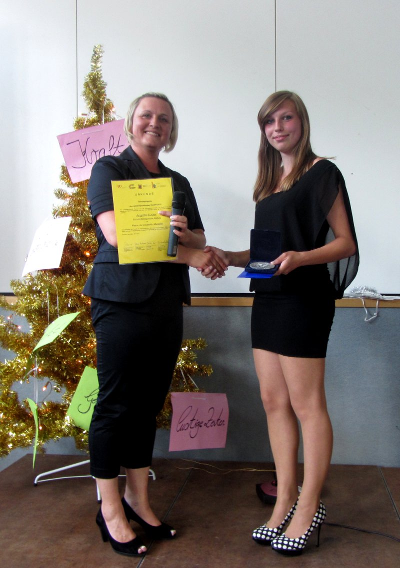Der Abschlussschülerin Angelika Eucker wurde vom Landessportbund und der Sportjugend Hessen der Schulsportpreis 2013 für besondere Leistungen und Aktivitäten im Schulsport verliehen. Sportfachleiterin Sarah Althaus überreichte die Urkunde samt der Pierre-de-Coubertin-Medaille im Auftrag des Kultusministeriums. Zusätzlich durfte Frau Althaus auch einen Gutschein eines Sportfachgeschäftes aus Wehrda überreichen, der zu diesem Zweck gestiftet wurde.