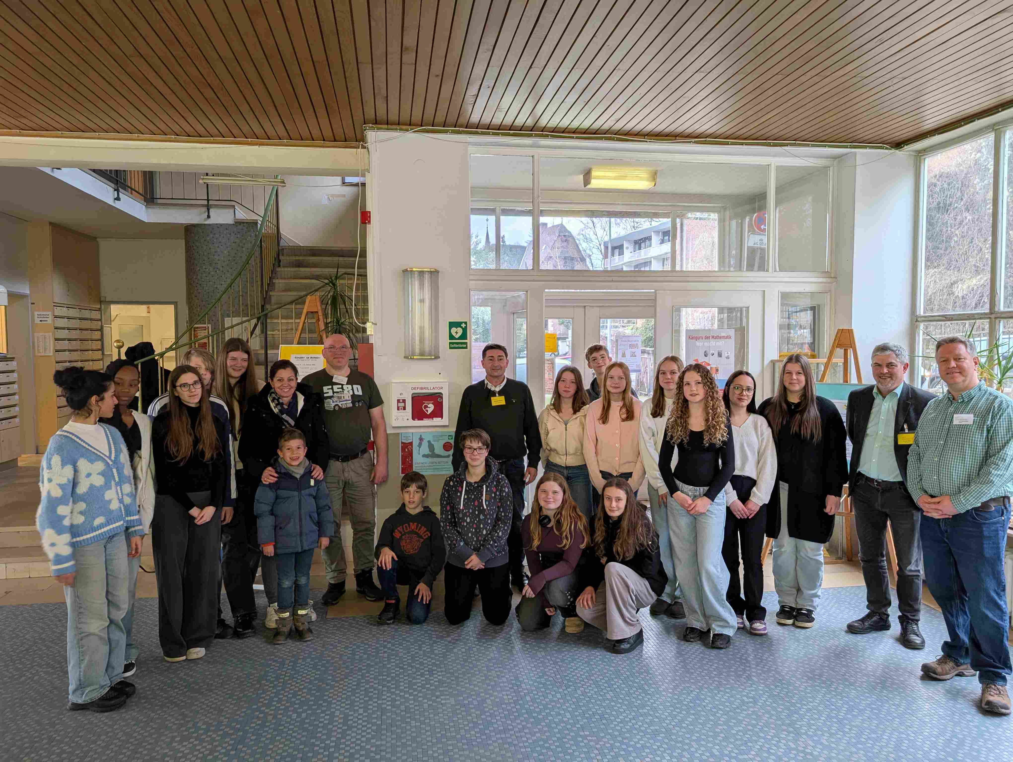 Im Rahmen der Tage der offenen Tür an der EvB war es nun endlich so weit: Der Förderverein der EvB, vertreten durch die zweite Vorsitzende Frau Lena Eisele, überreichte den Schülerinnen und Schülern der Schulsanitätsgruppe, Herrn Rautenberg sowie Schulleiter Konrad Simon das kostspielige Gerät. Dieses wurde zentral im Foyer der EvB montiert und ist dort für alle gut erreichbar.