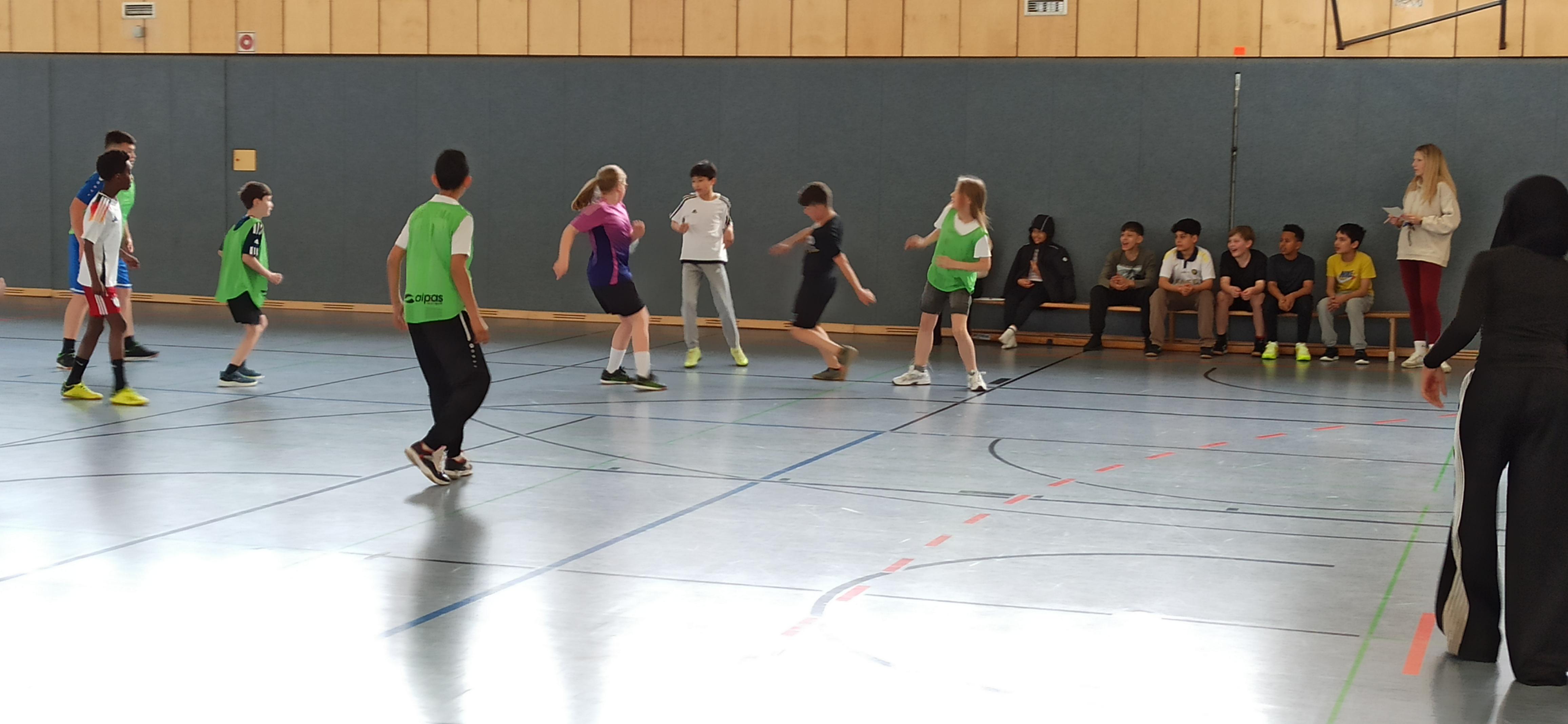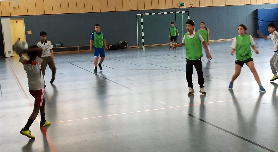 In der letzten Woche vor den Osterferien gab es noch ein Fußball-Turnier unserer 5.Klassen. Zwei Stunden Wettkampf-Spaß für alle - wer gerade nicht spielte, feuerte die eigene Klasse an. Die drei Klassen spielten jeweils 2x8 Minuten gegeneinander. Alle Kinder aus jeweils einer Klasse sollten pro Spiel mindestens einmal auf dem Spielfeld stehen. Eine Vorgabe war zusätzlich, dass immer vier Jungs und vier Mädchen im Einsatz sein mussten. Gecoacht wurden die Klassen von ihren Klassenleitungen, Herr Gawlina, Frau Goldberg und Herrn Schiebl. Die Spiele waren insgesamt ziemlich ausgeglichen, jede Klasse hätte an diesem Vormittag den ersten Platz verdient gehabt. Gewonnen wurde jeweils nur mit einem Tor Vorsprung. Doch am Ende hatte unsere Sportklasse (5bF) die Nase vorn. Sie gingen als stolze Sieger aus der Halle in der Frankfurter Straße. Auffällig war die Fairness, mit der sich die Klassen in dem Wettkampf begegnet sind. Organisiert wurde das Turnier von unserem Fußball-Spezialisten Herrn Gawlina.