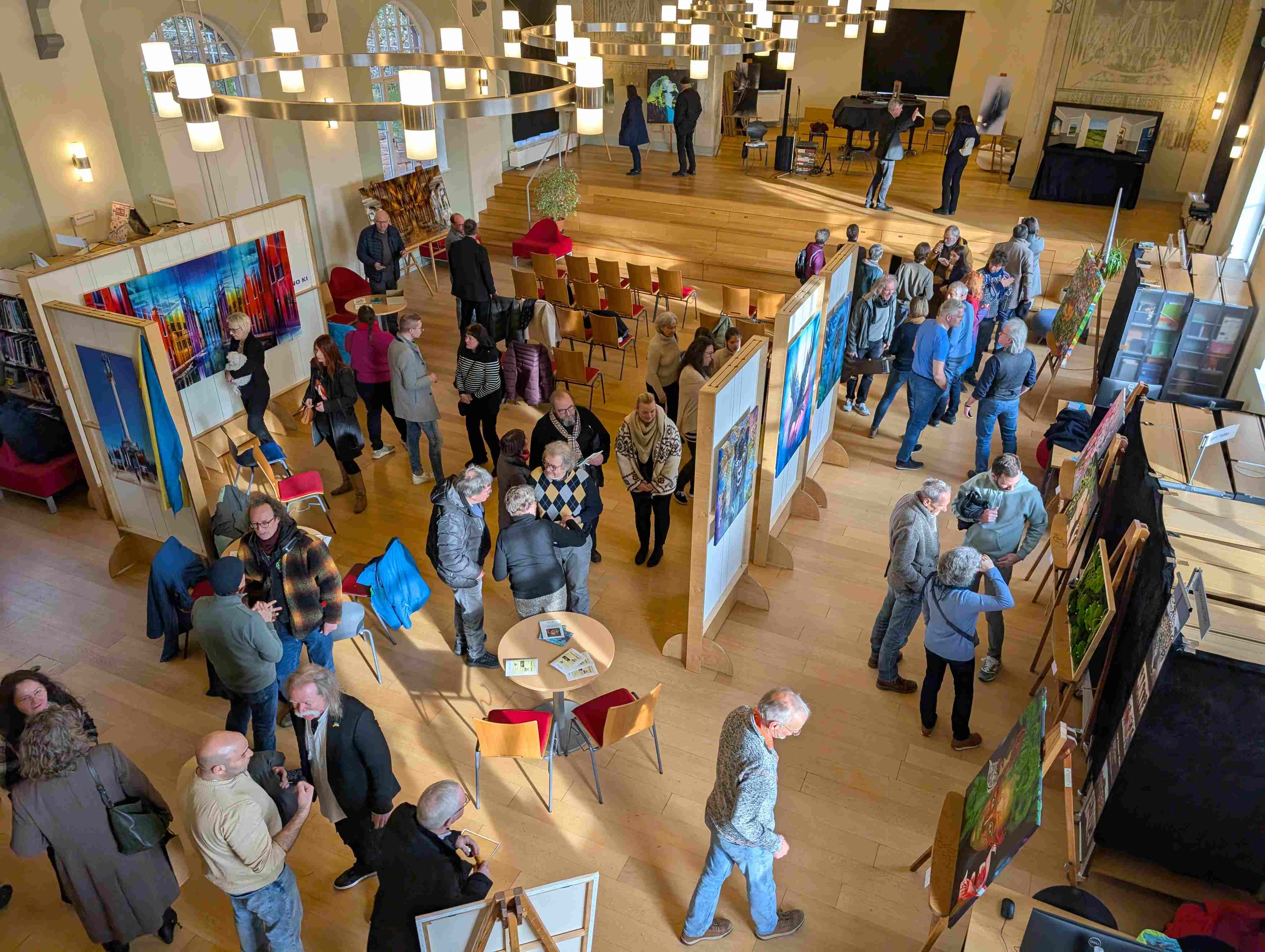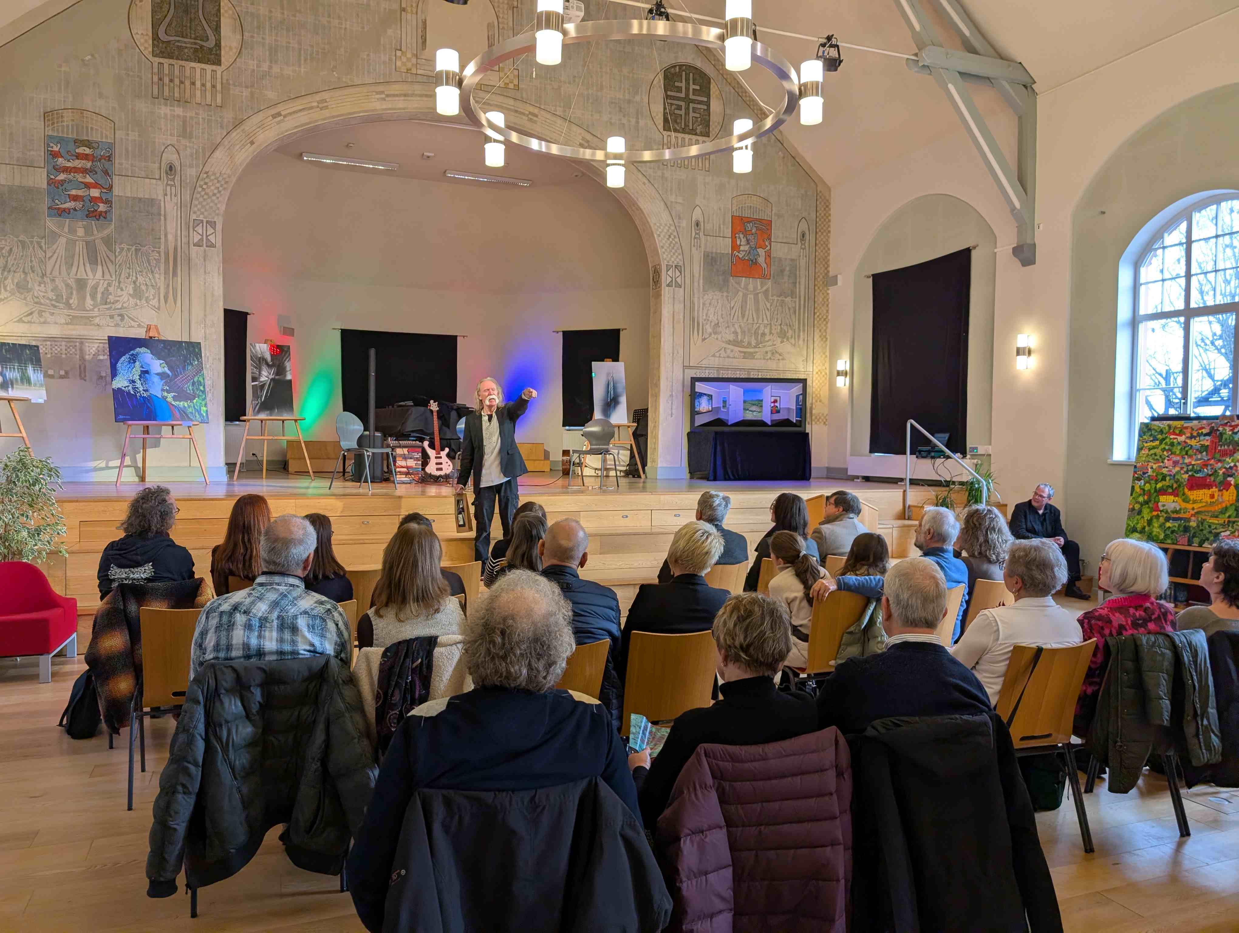 Am Samstag, den 17.1., wurde in der Mediathek der Emil-von-Behring-Schule zum 9. Mal die “Galerie in der Schule” eröffnet. Zum Teil großformatige Fotos und Gemälde des Künstlerpaares Werner Eismann und Inge Eismann-Nolte können zur Zeit im besonderen Ambiente des ehemaligen Turnergartens, jetzt Mediathek der Emil-von-Behring-Schule, betrachtet und erlebt werden. Auf musikalische Weise untermalt wurde die Veranstaltung durch Musik der Band “Softeis”, (heute mit Werner Eismann, Bass, und Gerhard Eismann, Gitarre, sowie Ronny Moucka, Gesang), die in Marburg schon seit Jahrzehnten als Garant für gute Rockmusik bekannt sind und heute “unplugged” Cover-Versionen von Deep Purple spielten.